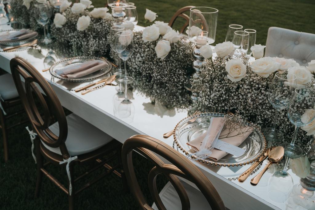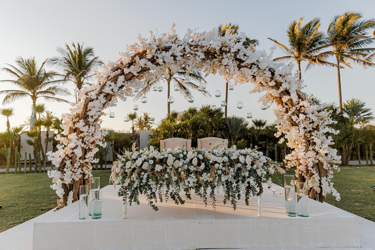 Detalles para acentuar el estilo Una mesa principal para la pareja enmarcada con un arco de flores es el componente clásico de las bodas románticas. Desde las sillas hasta las copas, cada elemento debe ser único y sobresaliente.