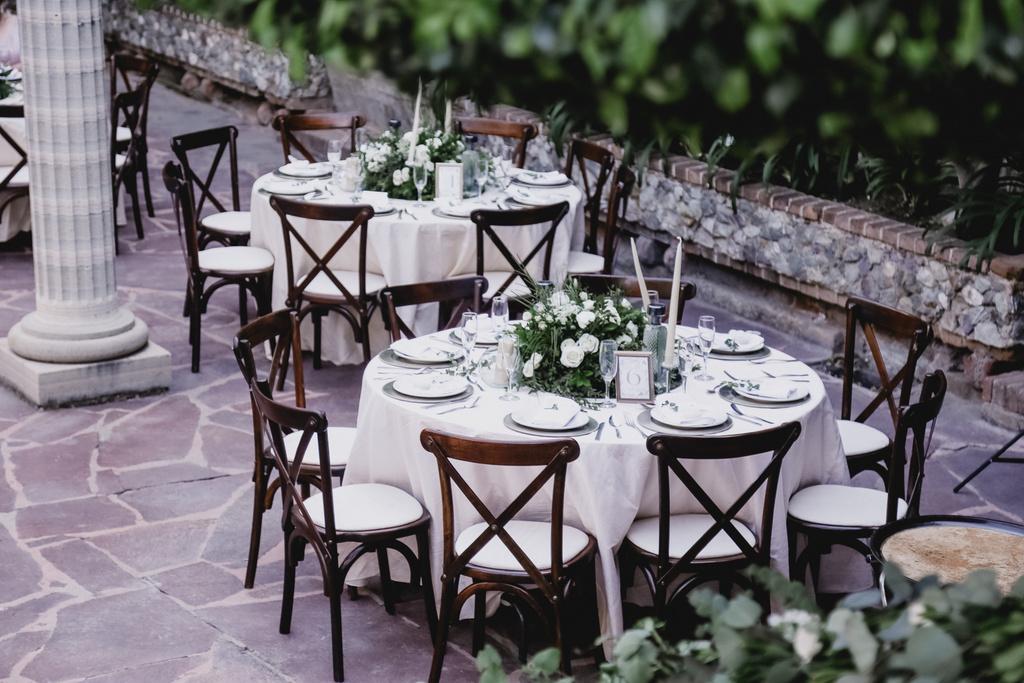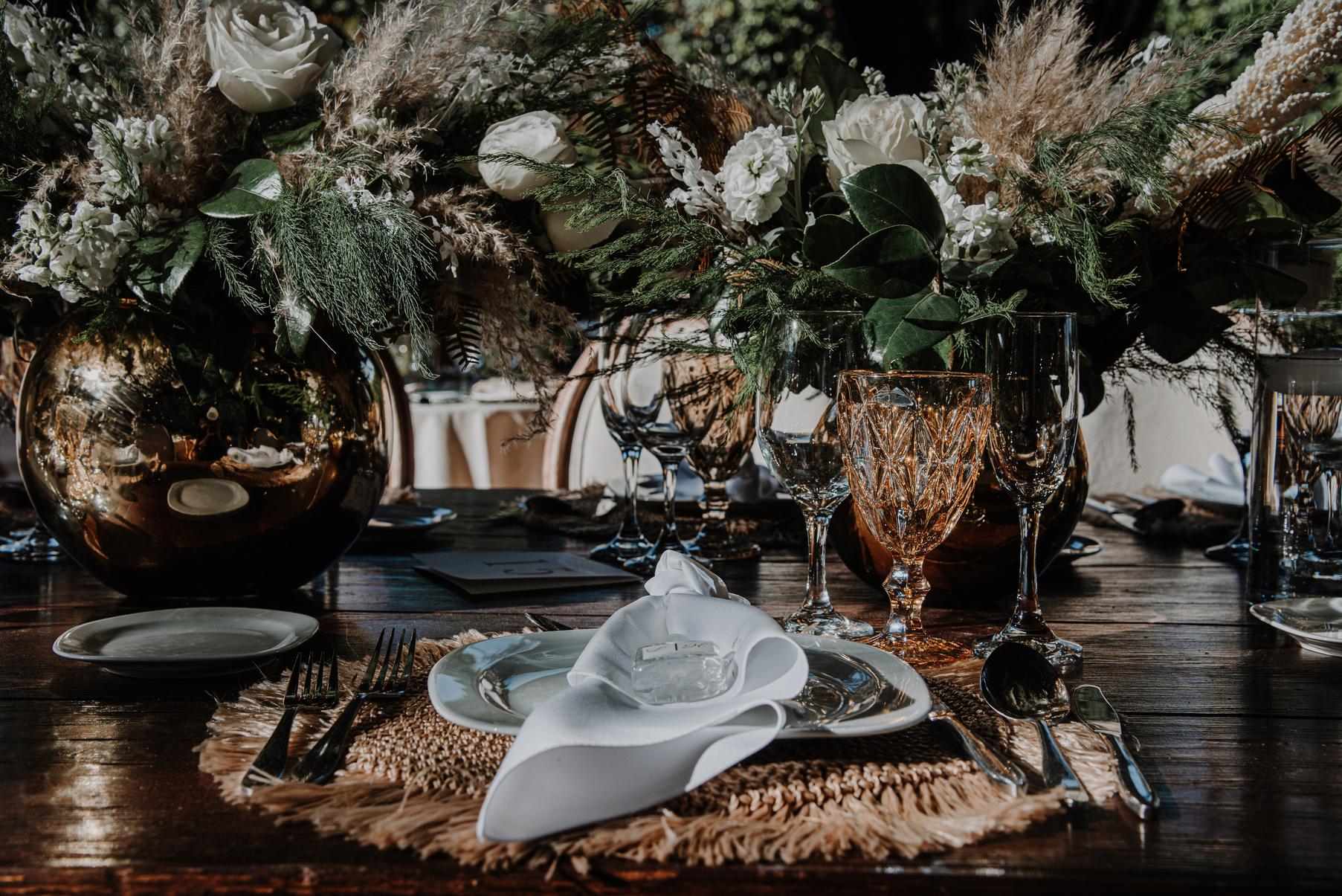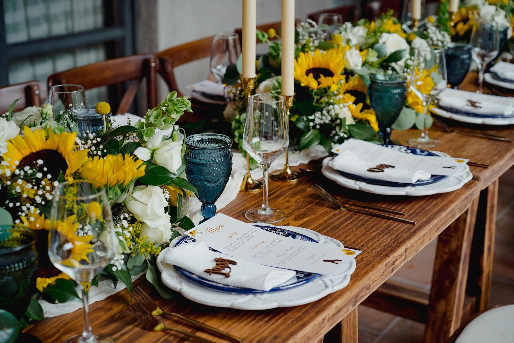 Las más populares son las mesas alargadas, aunque también se usan mesas circulares tradicionales. Los centros de mesa suelen ser copiosos y bastos, con una gran variedad de flores, así como especies fáciles de adquirir con distribuidores locales, como alcatraces, claveles, gardenias y crisantemos. En las bodas mexicanas se pueden incluir caminos bordados o confeccionados en cambaya. Y, un detalle imperdible es añadir tortilleros, molcajetes y cazuelitas de barro. La vajilla de azulejos y los platos y pozos de peltre también son propios del estilo.