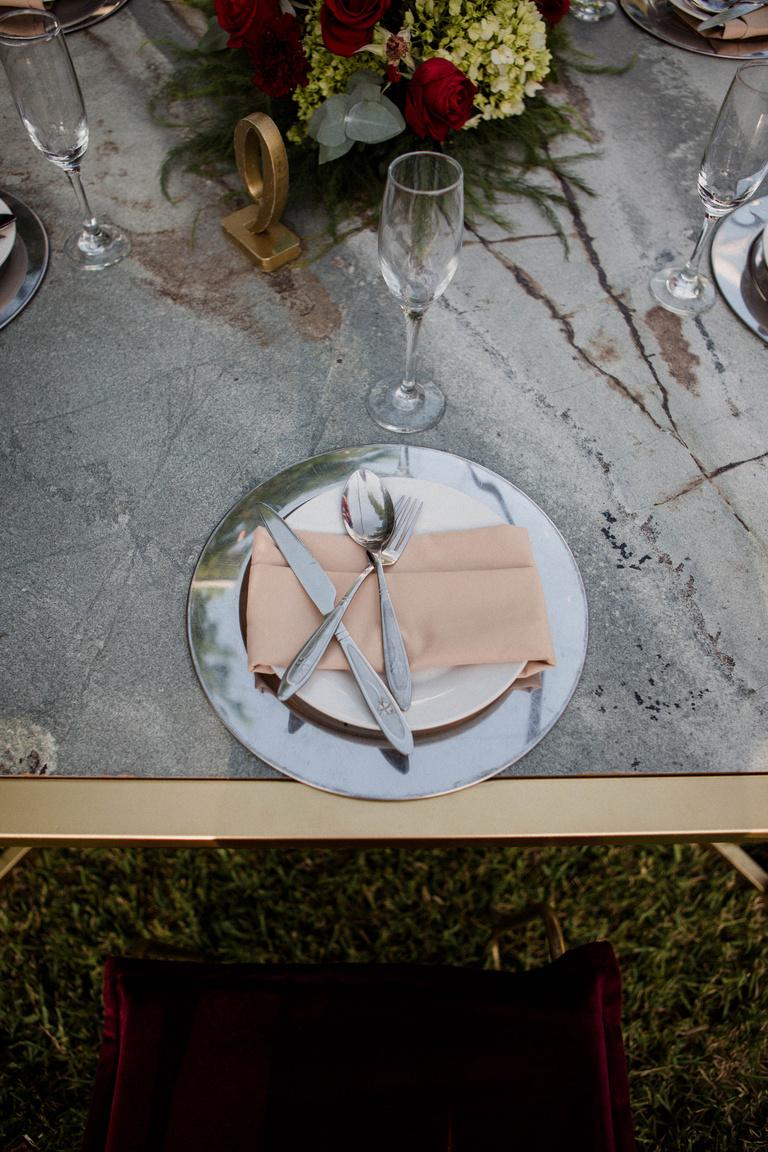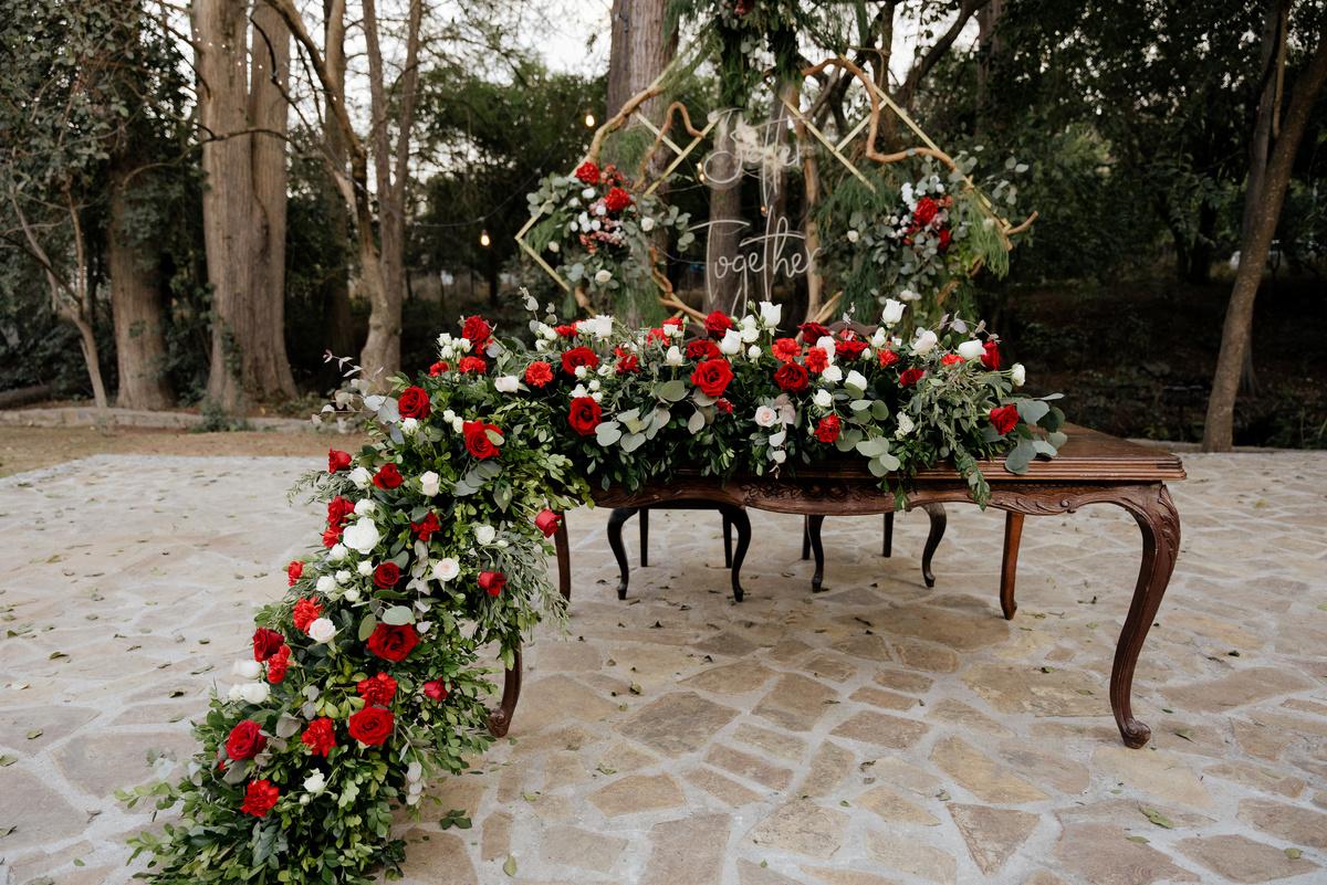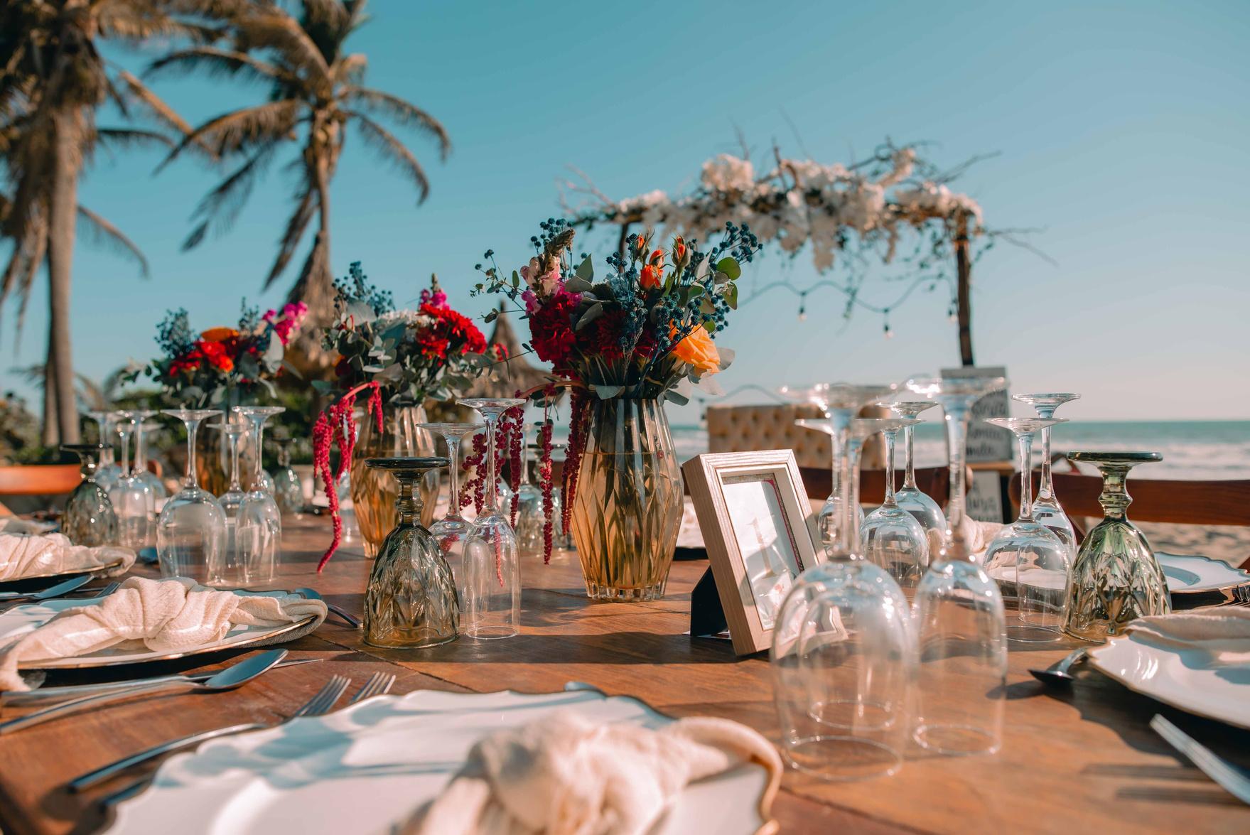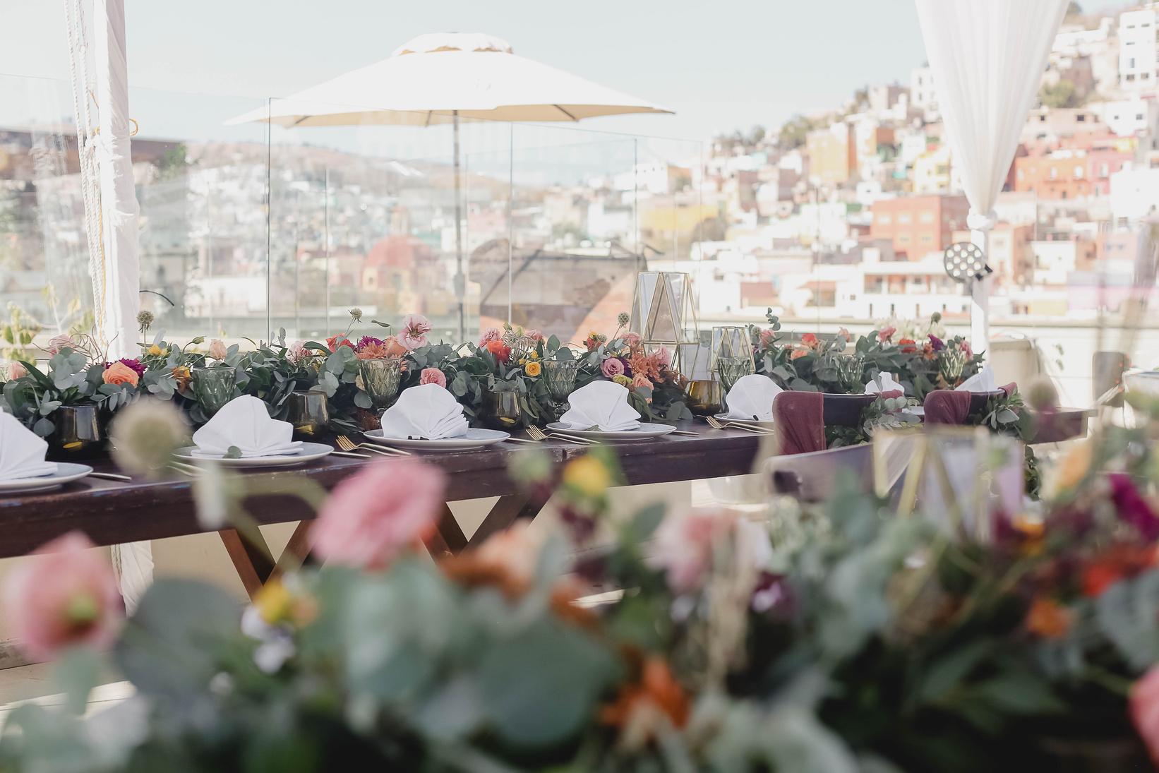 Las más populares son las mesas alargadas, aunque también se usan mesas circulares tradicionales. Los centros de mesa suelen ser copiosos y bastos, con una gran variedad de flores, así como especies fáciles de adquirir con distribuidores locales, como alcatraces, claveles, gardenias y crisantemos. En las bodas mexicanas se pueden incluir caminos bordados o confeccionados en cambaya. Y, un detalle imperdible es añadir tortilleros, molcajetes y cazuelitas de barro. La vajilla de azulejos y los platos y pozos de peltre también son propios del estilo.