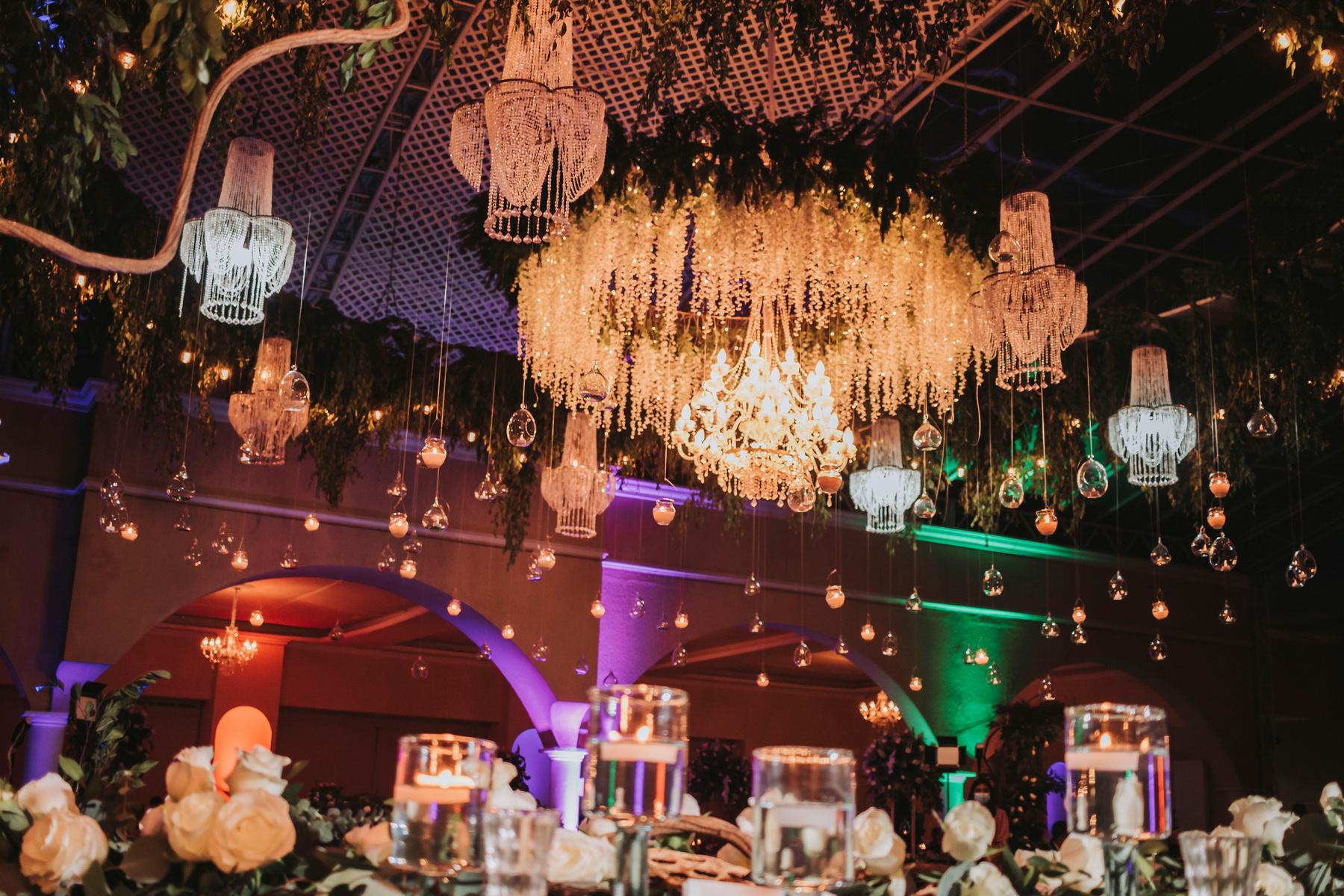 Juegos de iluminación, que incluyen efectos de oscuridad durante el baile de pareja seguidos por lluvias de lucecitas, luces láser e iluminación en tonos vibrantes.