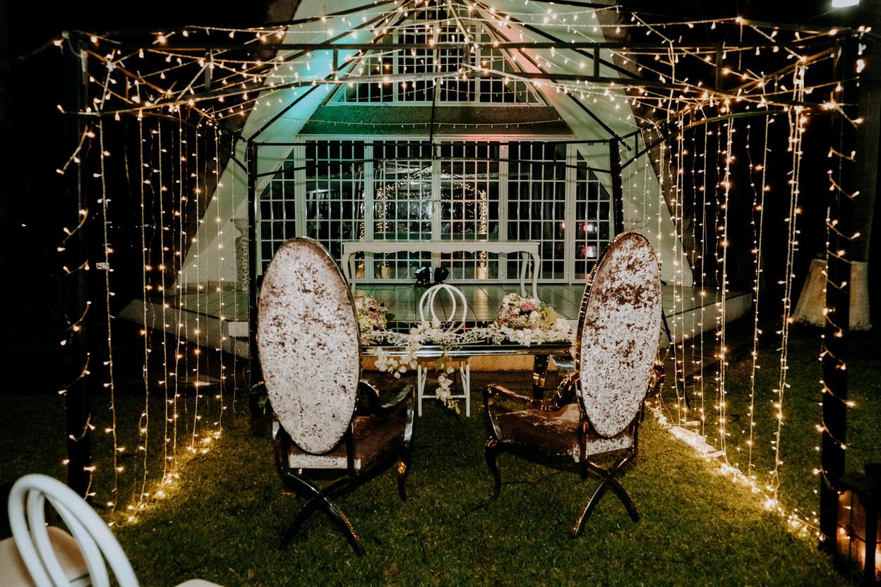 No pueden faltar muros verdes con letreros de neón, o sillones elegantes rodeados de plantas y macetas. Sillones de grandes orejas pueden distribuirse junto a sillas de jardín o, incluso, barriles y bancos de bar. La iluminación se suele conformar con bombillas industriales grandes, hileras de foquitos y candelabros vintage.