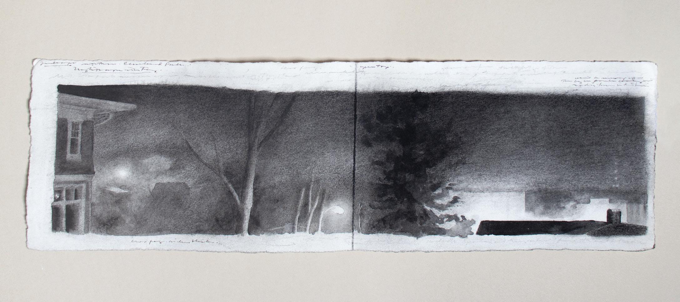 The monochromatic drawings of Molly Springfield, Charles Ritchie and Wesley Clark make a poetic connection between drawing, writing, reading and thinking. Springfield obscures the meaning of written language in her minutely detailed, enlarged drawings of found text, particularly marginalia as in of eer. The underlining, accents and notes scrawled in the margins of books that she has discovered in libraries and bookstores are cropped, blown up and meticulously copied in pencil by hand. Charles Ritchie’s minuscule handwriting adds a diaristic touch to his very intimate Nightscape with Fog. Drawn from the perspective of the artist looking out onto his suburban street, the viewer enters the artist’s space and mind. The smudged graphite contributes to the moody, streetlight-lit atmosphere. Wesley Clark