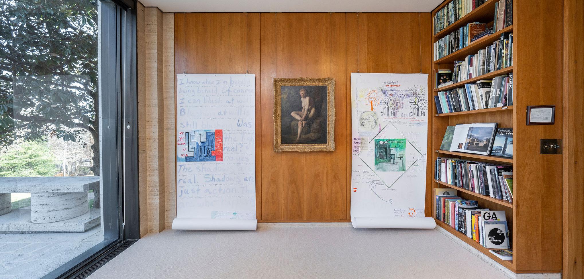 Engaging time, K. Lorraine Graham’s performance-based writing installation, Study, is in response to Thomas Couture’s Seated Nude in Landscape. This feminist intervention would not be possible without the passage of time, expanding societal understandings of gender, sexuality, and autonomy. Molly Springfield’s graphite drawing, mutually destructive, is a rendering of a Virginia Woolf’s To the Lighthouse text excerpt. The reference to Woolf is connected to Joan Miró, who respectively engaged subgenres of surrealism and automatism in his work. Leigh Davis joins this gathering, considering the future— life after death. Her video, Workshops, explores end-of-life experiences and engages various cultural and religious beliefs. Some of the collaged visuals in the film have been appropriated for new life and function, transitioning and repurposing their practical applications and connotations.