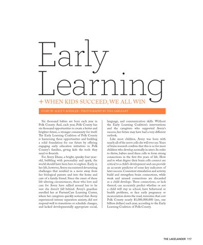 Six thousand babies are born each year in Polk County. And, each year, Polk County has six thousand opportunities to create a better and brighter future, a stronger community for itself. The Early Learning Coalition of Polk County is harnessing these opportunities and building a solid foundation for our future by offering engaging early education initiatives to Polk County’s families, giving kids the tools they need to flourish. For Avery Diane, a bright, spunky four-yearold, bubbling with personality and spark, the world should have been hers to explore. Early in her life, however, Avery encountered devastating challenges that resulted in a move away from her biological parents and into the home and care of a family friend. Since the onset of these life-altering circumstances, those who love and care for Avery have rallied around her to be sure she doesn’t fall behind. Avery’s guardian enrolled her at FurtureCare Learning Center, where her caregivers quickly noticed that Avery experienced intense separation anxiety, did not respond well to transitions or schedule changes, and lacked developmentally appropriate social,