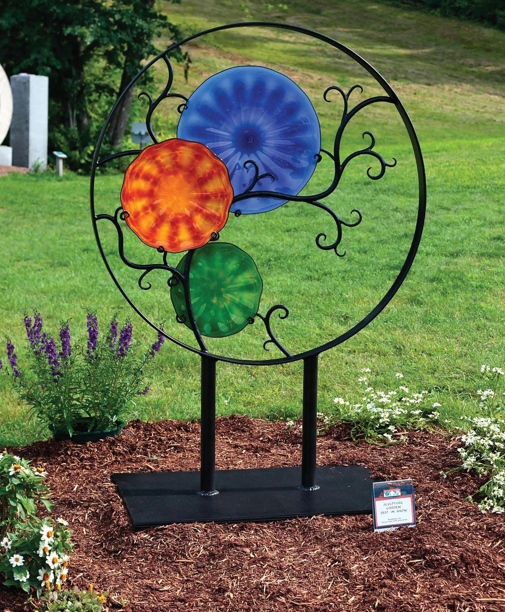 It’s in his garden sculptures that Macomber’s whimsical side fully emerges. His signature pieces include towering outdoor sculptures that reach five and a half feet tall. Macomber has said that blowing glass is an abstract process that is technically challenging, but it’s exciting because the results are so immediate.