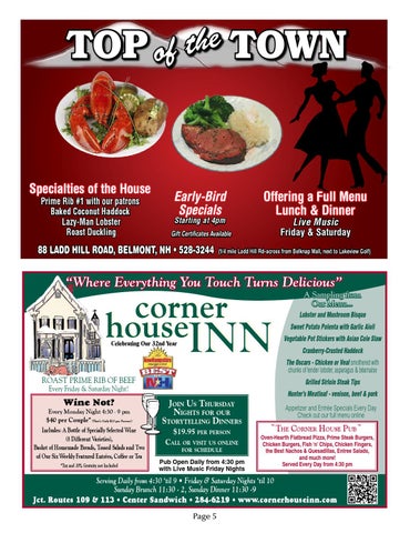 Serving Daily from 4:30 ‘til 9 • Friday & Saturday Nights ‘til 10 Sunday Brunch 11:30 - 2, Sunday Dinner 11:30 -9 Jct. Routes 109 & 113 • Center Sandwich • 284-6219 • www.cornerhouseinn.com Page 5