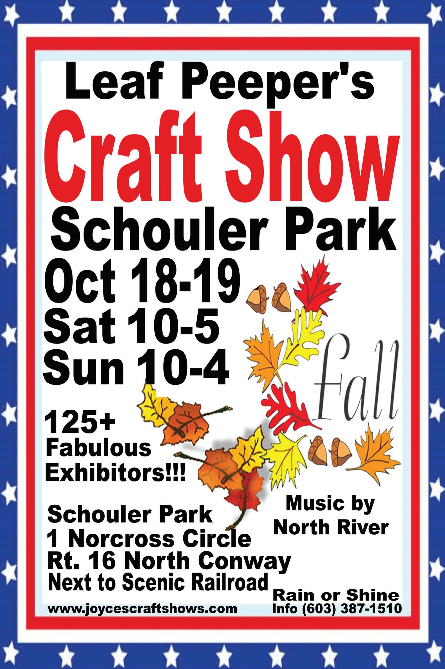 Oct. 18 & 19, Leaf Peepers Craft Fair, 10 a.m. – 5 p.m., 10/19: 10 a.m. – 4 p.m.; exhibitors, handmade items galore, Joyce’s Craft Shows, free admission, held under tents, friendly, leashed dogs welcome, held at Schouler Park, 1 Nor-