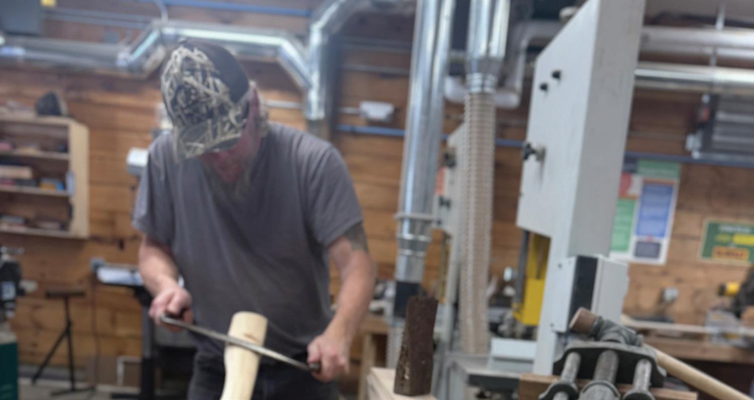 Robert “Doc” Dougherty demonstrates hand-carving an axe handle in the Makers Mill Woodshop, one of the free monthly clubs open to everyone—members and newcomers alike.
