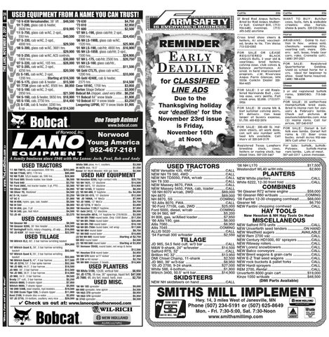 ‘79 630 ............................................$4,750 ‘73 610 ............................................$2,950 ‘71 600 ............................................$2,500 ‘07 NH L-190, glass cab/htr, 2 spd., 3500 hrs.......................................$24,450 ‘06 NH LS-190B, glass cab w/AC, 1520 hrs.......................................$25,900 ‘01 NH LS-190, cab/htr, 4800 hrs. ..$16,900 ‘05 NH LS-185B, glass cab/htr, 2-spd., 1500 hrs.......................................$24,900 ‘07 NH L-175, cab/htr, 2500 hrs. ....$20,750 ‘01 NH LS-160, glass cab/htr., 4900 hrs.......................................$11,500 ‘08 Gehl CTL75, glass cab w/AC, 1200 hrs.......................................$33,000 ‘06 Gehl 4240E, cab & heater, 2375 hrs.......................................$14,500 Case 1816C, 1700 hrs. ....................$3,950 Berlon Silage Defacer ......................$3,000 Bobcat 8A chipper, used very little....$6,250 ‘11 Bobcat 84” snow blade ..............$1,800 ‘10 Bobcat 60” V snow blade ..........$3,250 Loegering LVP90, 90” V snow blade $1,995