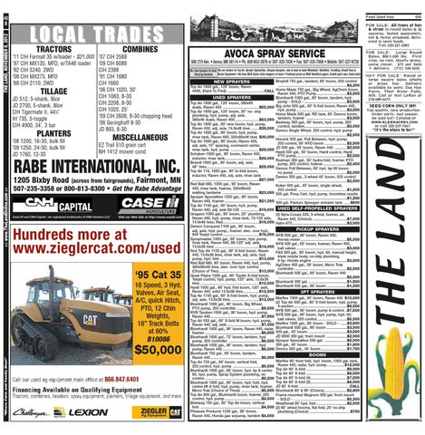 888 210 Ave. • Avoca, MN 56114 • Ph. 800-653-2676 or 507-335-7830 • Fax: 507-335-7808 • Mobile: 507-227-6728 40+ Used Sprayers On Hand We are dealers for Top Air, Sprayer Specialties, Gregson Sprayers, new & used on hand Wheathart, Westfield, FarmKing, Brandt Vacs & Balzer Equipment • We have NEW Balzer stalk choppers on hand • Truckload prices on NEW Westfield augers, Brandt grain vacs, Batco belts Financing Available