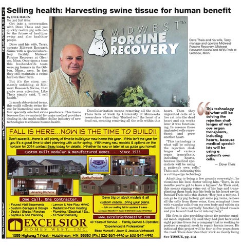 heart. Then they is what will be implanted cells of a solving the live rat into the dead rejection chalheart and six weeks later it was functionlenges of variing. In essence these ous organ implanted cells reprotransplants, duced and grew including another heart. hearts, because “This technology is medical specialwhat will be solving ists will be the rejection challenges of various using a organ transplants, patient’s own including hearts, cells. because medical specialists will be using — Dave Theis a patient’s own cells,” Theis said, indicating this is cutting-edge technology. Admitting to being a few pounds overweight, he visualizes his local doctor telling him, “Dave, in six months you’ve got to have a bypass.” As Theis said, this means ripping veins out of his legs and transplanting them back into his body in his heart cavity. Instead Theis tells this doctor, “Hey just a minute. I can go to my pig factory, get some pig veins, remove all the cells from those veins, then reimplant these with vascular cells from my own body and within six months I’ll have normally functioning blood vessels and you haven’t had to cut into my body.” His firm is also providing tissue for porcine surgical mesh implants. He said they had just harvested eight porcine livers for a company that is working to produce a surgical mesh to repair hernia issues. He indicated this project will be four to five years down the road. Theis describes their work as mostly being See TISSUE, pg. 11A