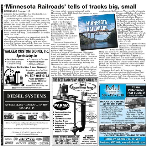 ‘Minnesota Railroads’ tells of tracks big, small RAILROADS, from pg. 11B railroads during that time that Glischinski documents in that section of his book. Glischinski’s photo collection also records the hay days of Minnesota railroading during the 1940s and 1950s. That was the era when steam was giving way to diesel and even a few gas-electric trains. A 1947 photo, by Ronald V. Nixon, records the panorama of the Mississippi River Valley from the top of Barn Bluff as a steam-powered mail and express train heads toward Red Wing. Glischinski tells the reader about that train: “The steam locomotive is a streamlined 4-6-4-F7class Hudson. Designer Otto Kuhler styled the shrouding with orange and gray paint and silver wings. Six Hudsons were built by American Locomotive in 1938 for heavy high-speed passenger service.