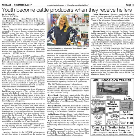 Youth become cattle producers when they receive heifers By DICK HAGEN The Land Staff Writer ST. PAUL, Minn. — Each October at the Minnesota Beef Expo, the Minnesota Youth Beef Experience Program awards heifer calves to young people so they can achieve their dreams of entering the beef business. Katie Fitzgerald, 2016 winner of an Angus heifer donated by Purfeerst Farms, summed up being a MYBEP winner this way: “Over the course of our time together, Eli, my heifer, has become one of my best friends and always puts a smile on my face.” Young people ages 12-16 involved in FFA, a junior breed association or 4-H from the five-state area of Minnesota and surrounding states are eligible. Recipients also get an Andis clipper, two straws of semen from Select Sires, a show stick, a clipper bag, halter and neck rope, and 200 pounds of grain from Purina. This year almost 90 individuals applied for one of the 11 MYBEP heifers. Claudine Goodrich is MYBEP coordinator. She said, “This program very effectively helps young people fulfill their dreams to become beef people and helps advance their goals to someday become part of this essential and great industry.” Applicants must meet certain criteria including a commitment to agriculture, defined goals, financial need and a proper setting to raise the animal. They write a letter of intent and garner two recommendations. Judges review applications. Getting a heifer calf is a big responsibility. Each recipient is responsible for raising and breeding the heifer. They must maintain records and provide reports, prepare a scrap book of highlights, compete in several shows and communicate with the coordinator and mentor several times a month. The idea for this program grew from Minnesota Beef Expo board members. They realized each had a mentor who helped guide them in raising cattle. Therefore, the board members wanted to generate a program that provided a heifer to a young person and encouraged the young person to connect with a knowledgeable cattleperson. “Some great examples of the impact of MYBEP on recipients are Matthew Pearson and Adam Anderson. Pearson of Pearson Cattle received a Simmental heifer in 2005 from Gramms Farm, and now 12 years later is giving a heifer to Grace Britton. Adam Anderson of Sleepy Eye Creek Farm won an Angus heifer donated by Joe Hammel of Freeburg Ridge Farm in 2008. Now nine years later, Adam is donating a heifer to Kodi Bunderman. These two young men are unselfishly paying it forward,” said Goodrich. The motto of MYBEP is “inspiring youth in agriculture by helping dreams come true.” Goodrich estimated at least 90 percent of the participants stay in agriculture. Another feature is the MYBEP Achievement Award. One winner is selected from the youth who