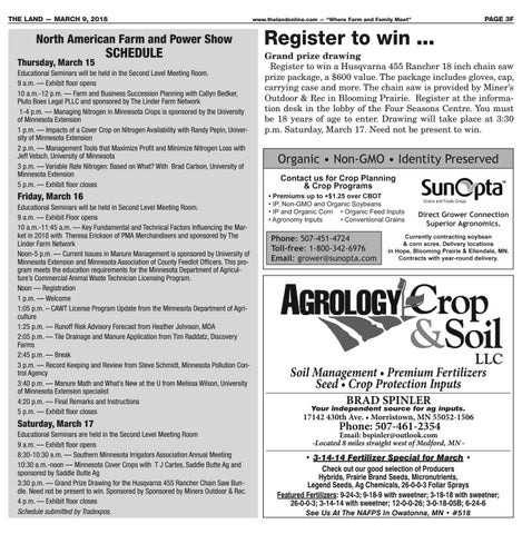 Saturday, March 17 Educational Seminars are held in the Second Level Meeting Room 9 a.m. — Exhibit floor opens 8:30-10:30 a.m. — Southern Minnesota Irrigators Association Annual Meeting 10:30 a.m.-noon — Minnesota Cover Crops with T J Cartes, Saddle Butte Ag and sponsored by Saddle Butte Ag 3:30 p.m. — Grand Prize Drawing for the Husqvarna 455 Rancher Chain Saw Bundle. Need not be present to win. Sponsored by Sponsored by Miners Outdoor & Rec. 4 p.m. — Exhibit floor closes Schedule submitted by Tradexpos.