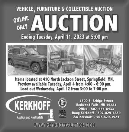 LISTING 507-345-4523 • 800-657-4665 418 South Second Street, Mankato, MN 56001 www.thelandonline.com 418 S. Second Street • Mankato, MN 56001 Phone: 507-345-4523 or 800-657-4665 Fax: 507-345-1027 Deadline is 8 days prior to publication. * I ndicates early deadline, 9 days prior to publication. Thank you for reading The Land. We appreciate it! Upcoming Issues of THE LAND Ask Your Auctioneer to Place Your Auction in The Land! April 14, 2023 April 28, 2023 May 12, 2023 Have you returned the 2023 subscription card for THE LAND?-