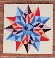 Directly across the street from the World is a quilt named “A Cup Shared with Friends.” This quilt’s unique design was created by Jill Schneider’s art students, as were other quilts on the trail. It’s hosted by the Stomping Grounds Coffee Shop. Within a short walk from there are the Methodist and Congregationalist churches. Both host lovely quilts. And there are more!