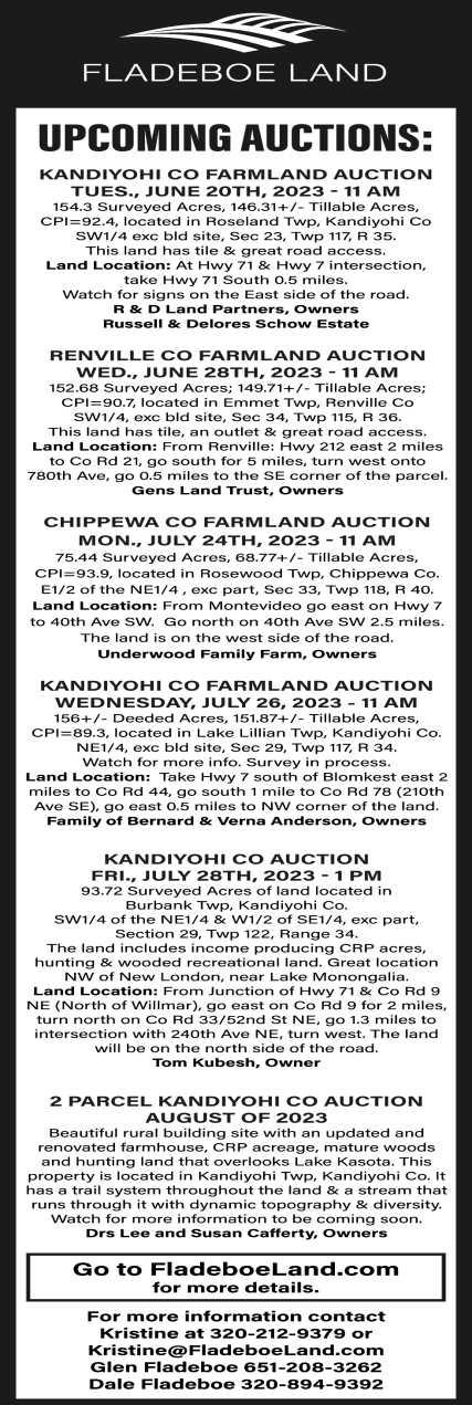 Subscription and Distribution: Free to farmers and agribusinesses in Minnesota and northern Iowa. $49 per year for non-farmers and people outside the service area. The Land (USPS 392470) Copyright © 2023 by The Free Press Media is published biweekly by The Free Press, 418 S 2nd Street, Mankato, MN 56001-3727. Business and Editorial Offices: 418 S. 2nd Street, Mankato, MN 56001-3727, Accounting and Circulation Offices: Steve Jameson, 418 S 2nd Street, Mankato, MN 56001-3727. Call (507) 345-4523 to subscribe. Periodicals postage paid at Mankato, MN.