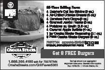 ENJOY 100% guaranteed, deliveredto-the-door Omaha Steaks! Get 8 FREE Omaha Steaks Burgers! Order The All-Time Grilling Faves! ONLY $99.99. Call 1-888-356-4180 and mention code 73375TNN or visit www. omahasteaks.com/GrillFaves5363. (mcn)
