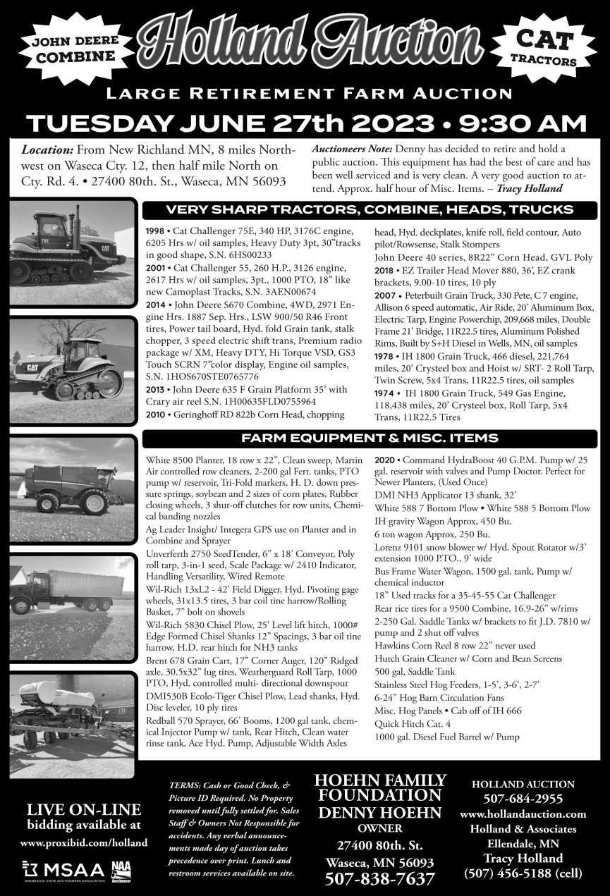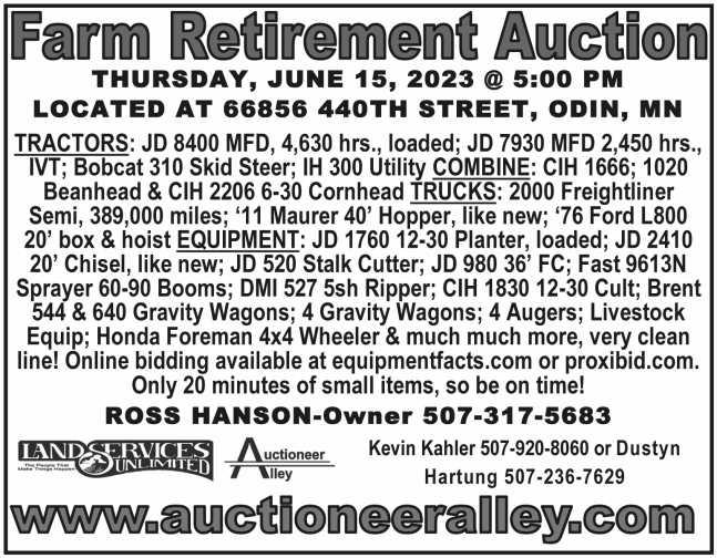 ADVERTISING NOTICE: Please check your ad the first week it runs. We make every effort to avoid errors by checking all copy, but sometimes errors are missed. Therefore, we ask that you review your ad for correctness. If you find a mistake, please call (507) 345-4523 immediately so that the error can be corrected. We regret that we cannot be responsible for more than one week’s insertion if the error is not called to our attention. We cannot be liable for an amount greater than the cost of the ad. THE LAND has the right to edit, reject or properly classify any ad. Each classified line ad is separately copyrighted to THE LAND. Reproduction without permission is strictly prohibited.