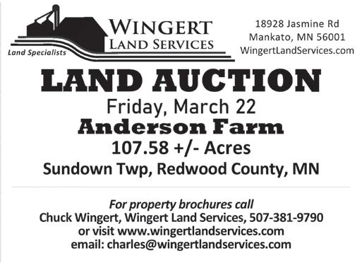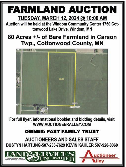 Auctioneer Alley ............................................................................................22 Beck's Hybrids 1 C & C Roofing 7 Carson Forsberg .............................................................................................12 Farm City Hub Club 5 Fladeboe Land ...............................................................................................18 Greenwald Farm Center ..................................................................................17 Greenway Seeds .............................................................................................13 Hertz Farm Management ...............................................................................21 Janesville Tire Service 11 Kannegiesser Truck Sales 3 Kerkhoff Auction and Real Estate ...................................................................19 Land Resource Management ...........................................................................20 Letcher Farm Supply, Inc. ................................................................................ 4 Mages Land Company & Auction Service .......................................................18 Maring Hamilton Auction ......................................................................... 19, 22 Mathiowetz Construction .................................................................................. 8 Mike's Collision & Repair Center ..................................................................... 7 Moening Family Farms LLC ...........................................................................21 Northland Buildings, Inc. ................................................................................. 6 Pruess Elevator, Inc. ......................................................................................17 Pumps Motor & Bearings LLC 6 Rush River Steel & Trim ................................................................................12 Schlauderaff Implement Co. 5 Schweiss Doors ..............................................................................................18 Smiths Mill Implement ...................................................................................17 SnirtStopper 9 Tony Montgomery Auctions ............................................................................21 Tradexpos Cover Wrap Veteran Car Donation .....................................................................................10 Wealth Enhancement Group ............................................................................15 Wesley Financial ............................................................................................10 Wingert Land Services ..................................................................................20 ADVERTISER LISTING 507-345-4523 • 800-657-4665 418 South Second Street, Mankato, MN 56001 • www.thelandonline.com 418 S. Second Street • Mankato, MN 56001 Phone: 507-345-4523 or 800-657-4665 Fax: 507-345-1027 Deadline is 8 days prior to publication. * I ndicates early deadline, 9 days prior to publication. Thank you for reading The Land. We appreciate it! Upcoming Issues of THE LAND Ask Your Auctioneer to Place Your Auction in The Land! March 15, 2024 March 29, 2024 April 12, 2024 Visit The Land staff at the NAFPS in Owatonna - March 14-16