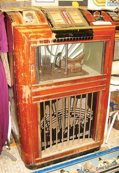 Ann’s grandfather also collected 10 juke boxes. The nine with motors he sold for a song; the tenth is in the museum. It sits alongside a piece of 1955 Armstrong linoleum her dad sold. He salvaged it from a child’s bedroom when a house was being torn down. A curious wooden cabinet full of slots turned out to be a department store’s rotating ribbon and lace dispenser. Metal canisters held rolls of ribbon which was measured out through the slots.