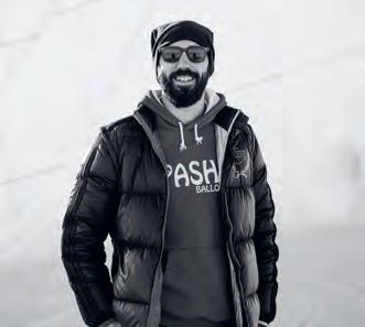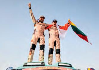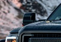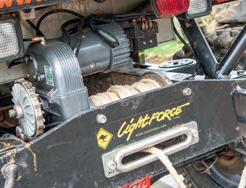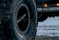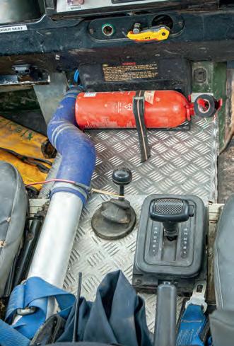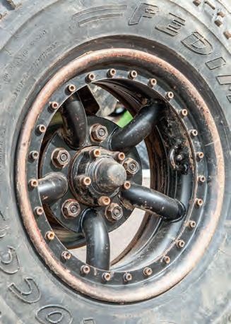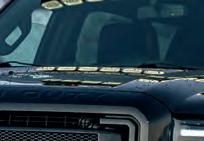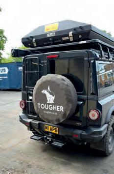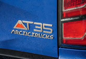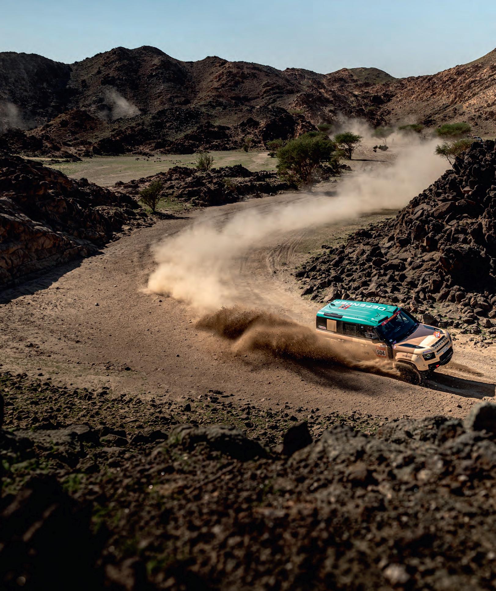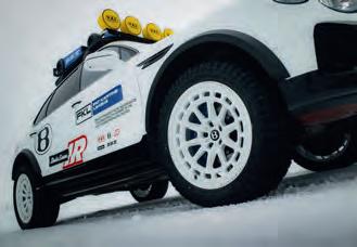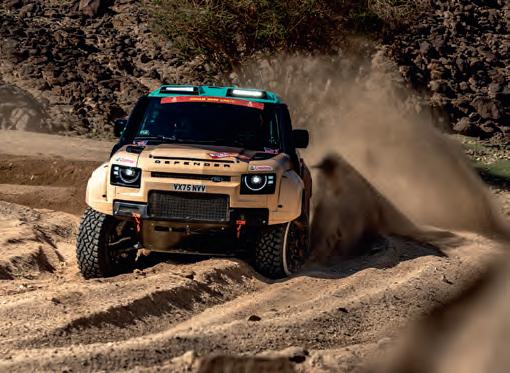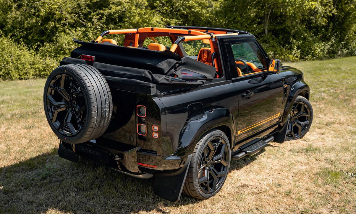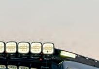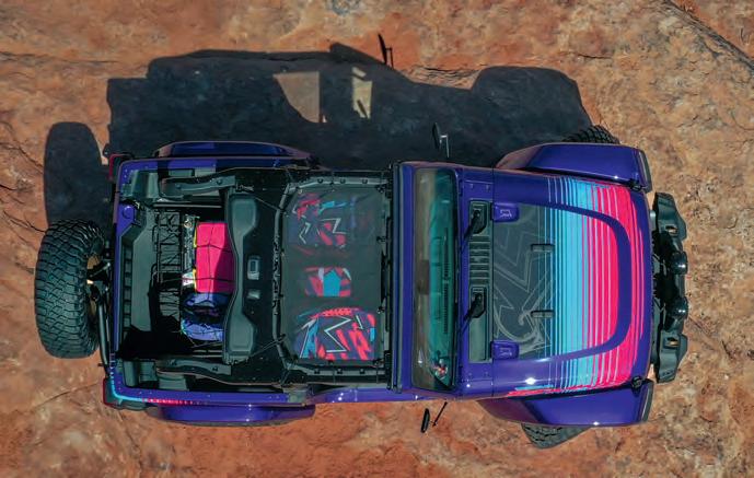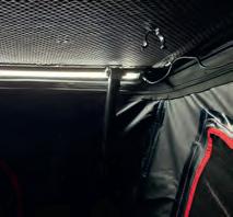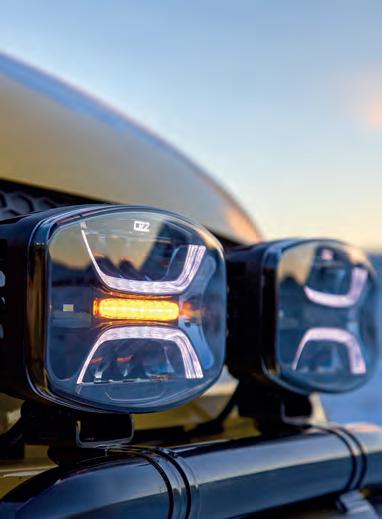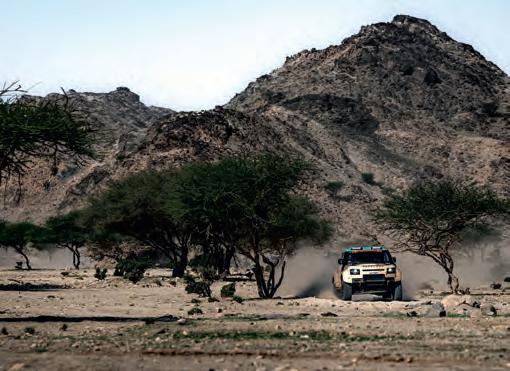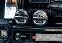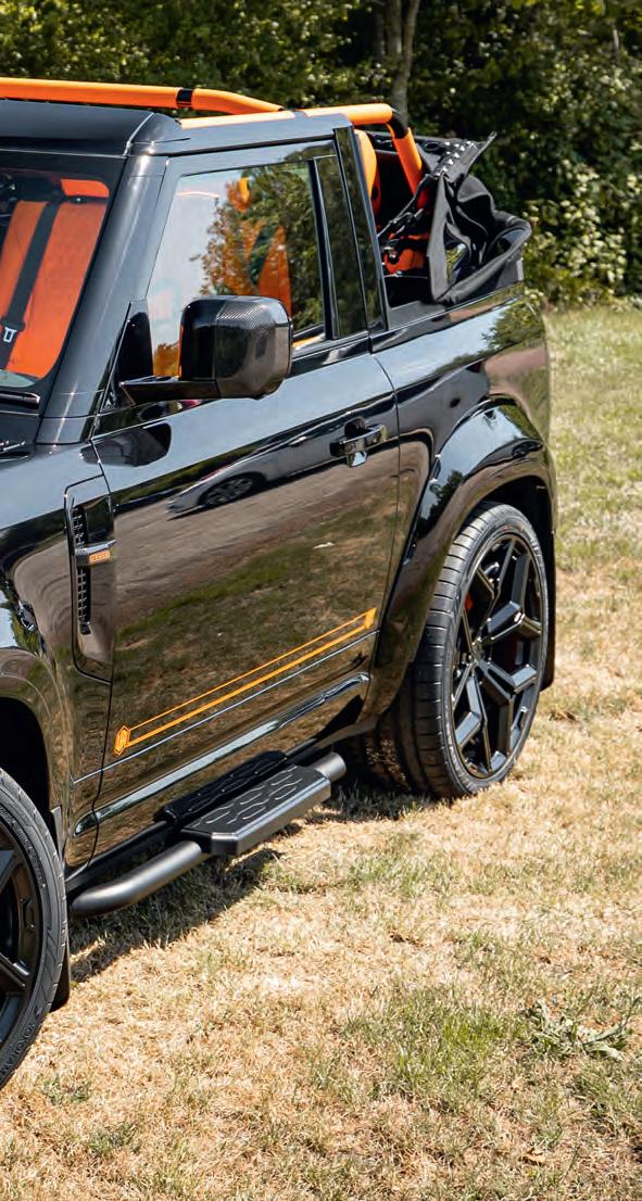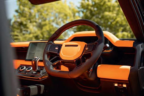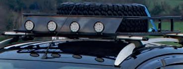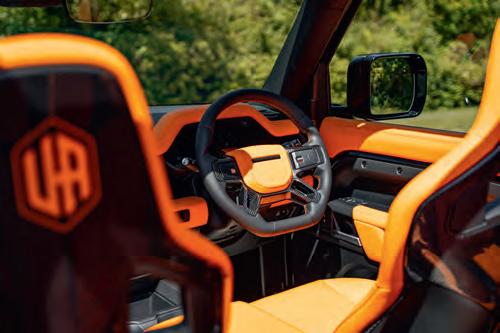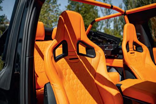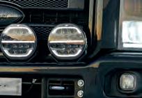 for the vehicle’s launch. This and the suspension lift bring the concept’s overall height to just under 2.5 metres, and it definitely looks jaunty on the single-piece forged 22” Brixton wheel rims that add a definite rally-raid touch to its image. Exposed front towing points and an Akrapovic titanium sports exhaust do the same, albeit with a little more subtlety, and then there’s a bank of four old-school spotlights up top whose bright yellow