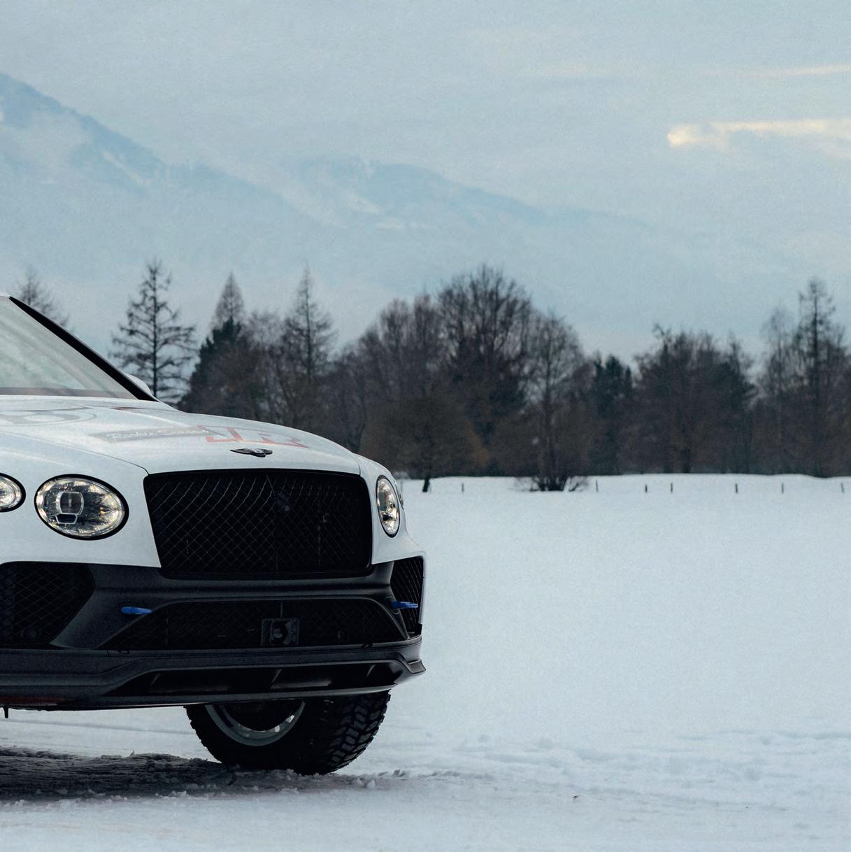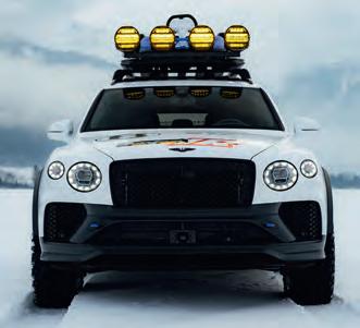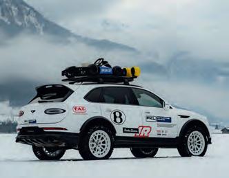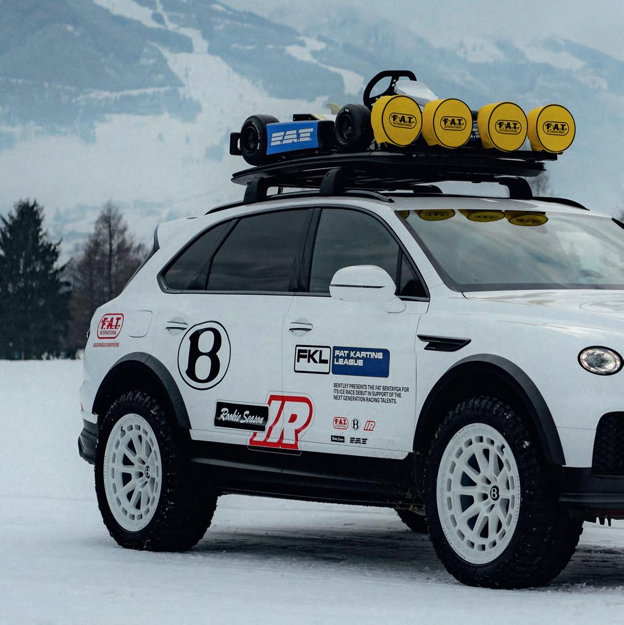 vehicle’s standard Bentley Dynamic Ride air suspension is retained, equipping it with a 48V electric active anti-roll control system; wading depth is quoted at a hefty 550mm. Up top, the Bentayga X carries a roof rack with a tent… sorry, make that an electric Bambino-size Go Kart. These are used in the FAT Karting League, which Bentley sponsors and whose Ice Race in the classic Austrian winter sports resort of Zell Am See provided the ideal backdrop