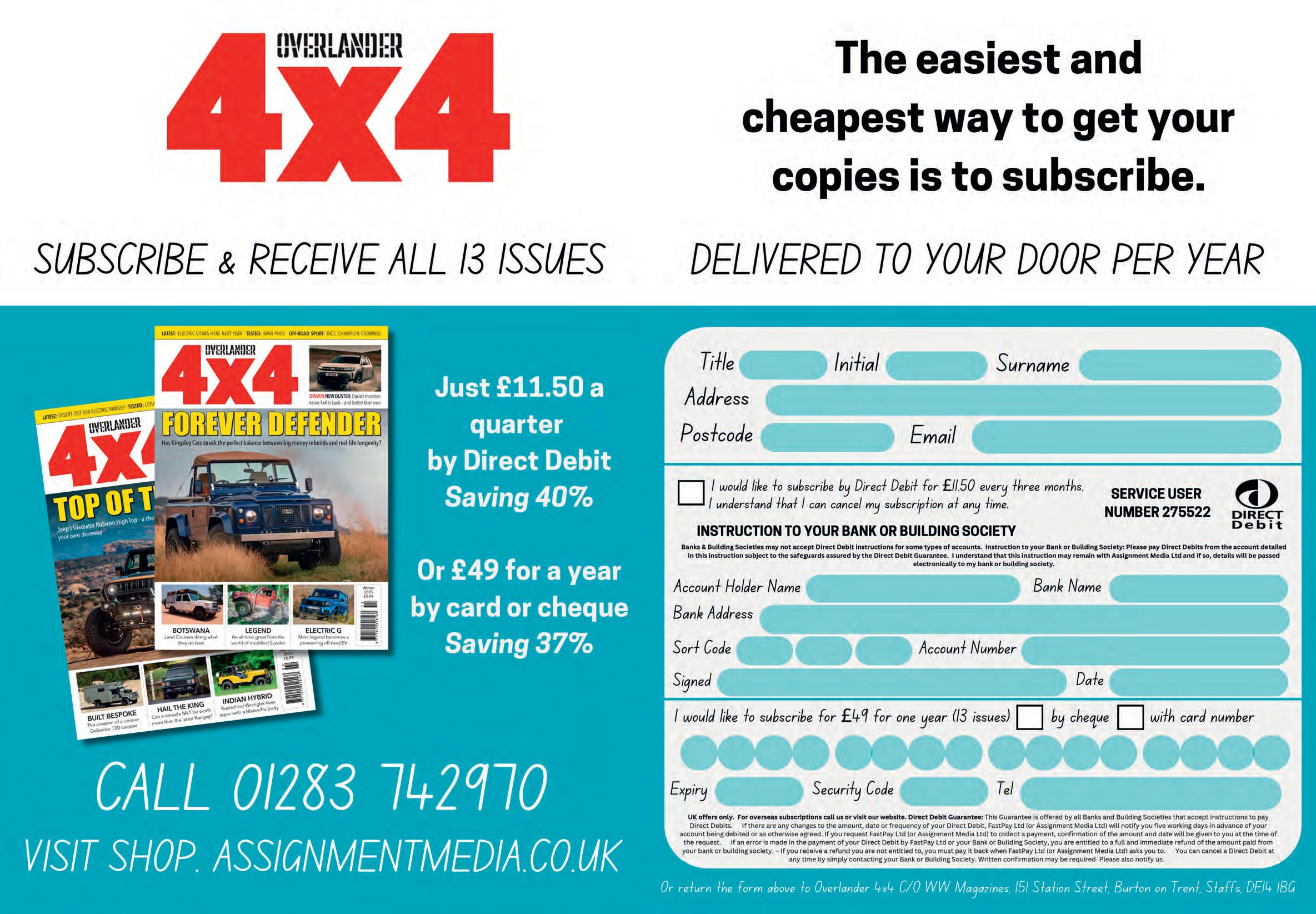 To subscribe to 4x4, or renew a subscription, call 01283 742970. Prices for 12 issues: UK £42 (24 issues £76); Europe Airmail/ROW Surface £54; ROW Airmail £78