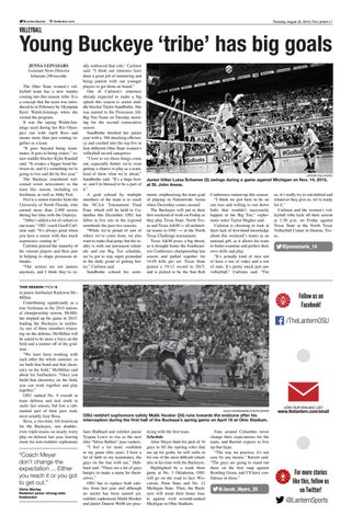 Young Buckeye ‘tribe’ has big goals JENNA LEINASARS Assistant News Director leinasars.2@osu.edu The Ohio State women’s volleyball team has a new mantra coming into this season: tribe. It is a concept that the team was introduced to in February by Olympian Kerri Walsh-Jennings when she visited the program. It was the saying Walsh-Jennings used during her Rio Olympics run with April Ross and means more than just coming together as a team. “It goes beyond being teammates. It goes to being sisters,” senior middle blocker Kylie Randall said. “It creates a bigger bond between us, and it’s something we’re going to live and die by this year.” The Buckeye sisterhood welcomed seven newcomers to the team this season, including six freshmen, as well as Abby Fesl. Fesl is a senior transfer from the University of North Florida, who earned more than 2,400 assists during her time with the Ospreys. “Abby’s added a lot of culture to our team,” OSU coach Geoff Carlston said. “It’s always great when you have a senior with that much experience coming in.” Carlston praised the maturity of his veteran players and their part in helping to shape preseason attitudes. “Our seniors are not juniors anymore, and I think they’ve re-