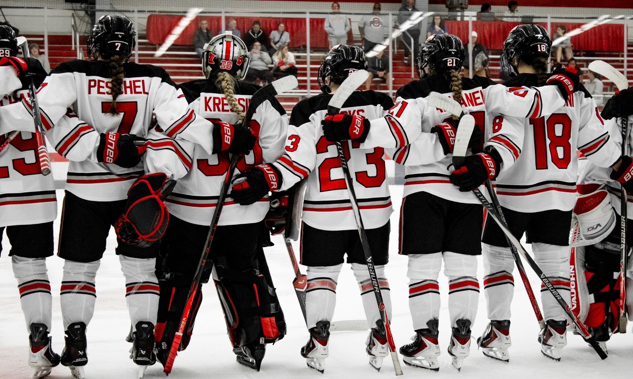 The Ohio State women’s hockey team sings the alma mater, “Carmen Ohio,” after the game against Durham Sept. 21. The Buckeyes defeated the Lords in an exhibition game 6-2. Credit: Brailee Rathburn