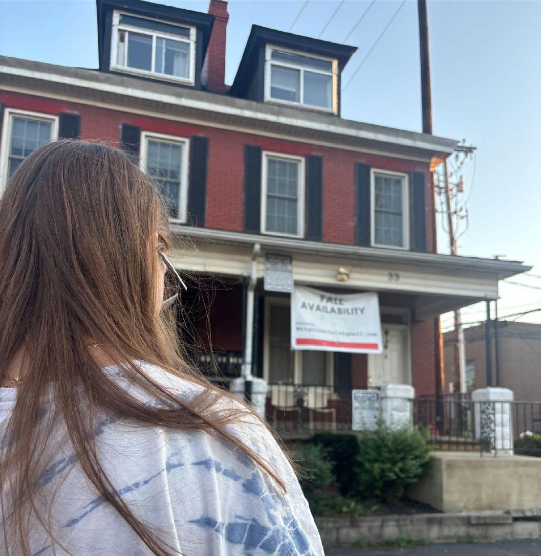 An Ohio State student stands outside off-campus housing advertising fall availability Sept. 14, 2025, in Columbus, Ohio.