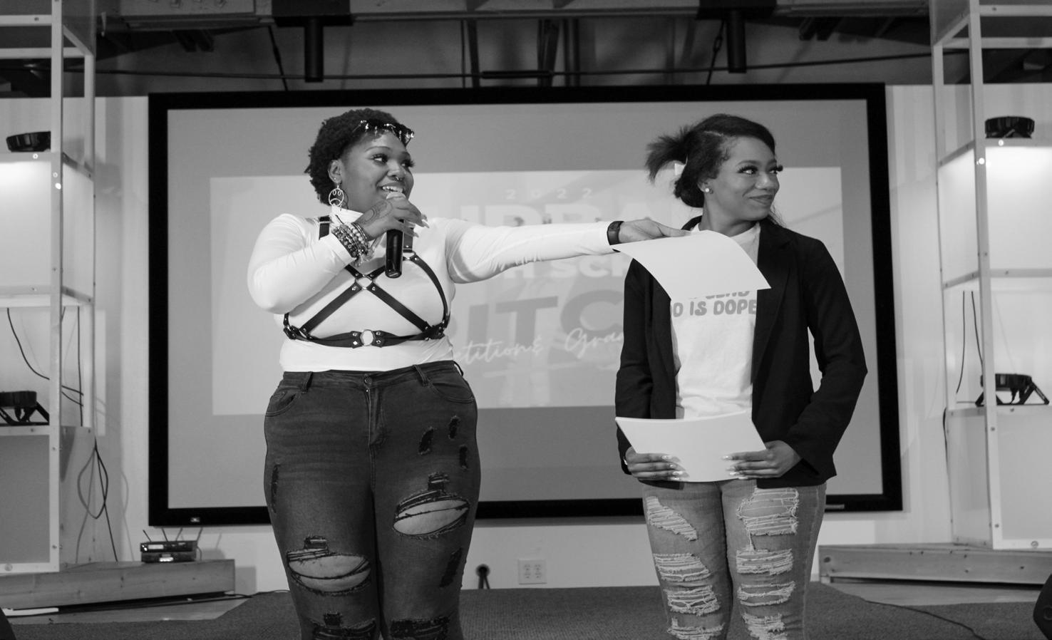 COURTESY OF URBAN BUSINESS DEVELOPMENT CENTER (THE U) Tahlayah Morrow concludes her presentation with The U CBUS CEO LoLo Mychael at the Urban Launch School Pitch Competitions in Downtown Columbus in April 2022.CONTINUED FROM PAGE 5