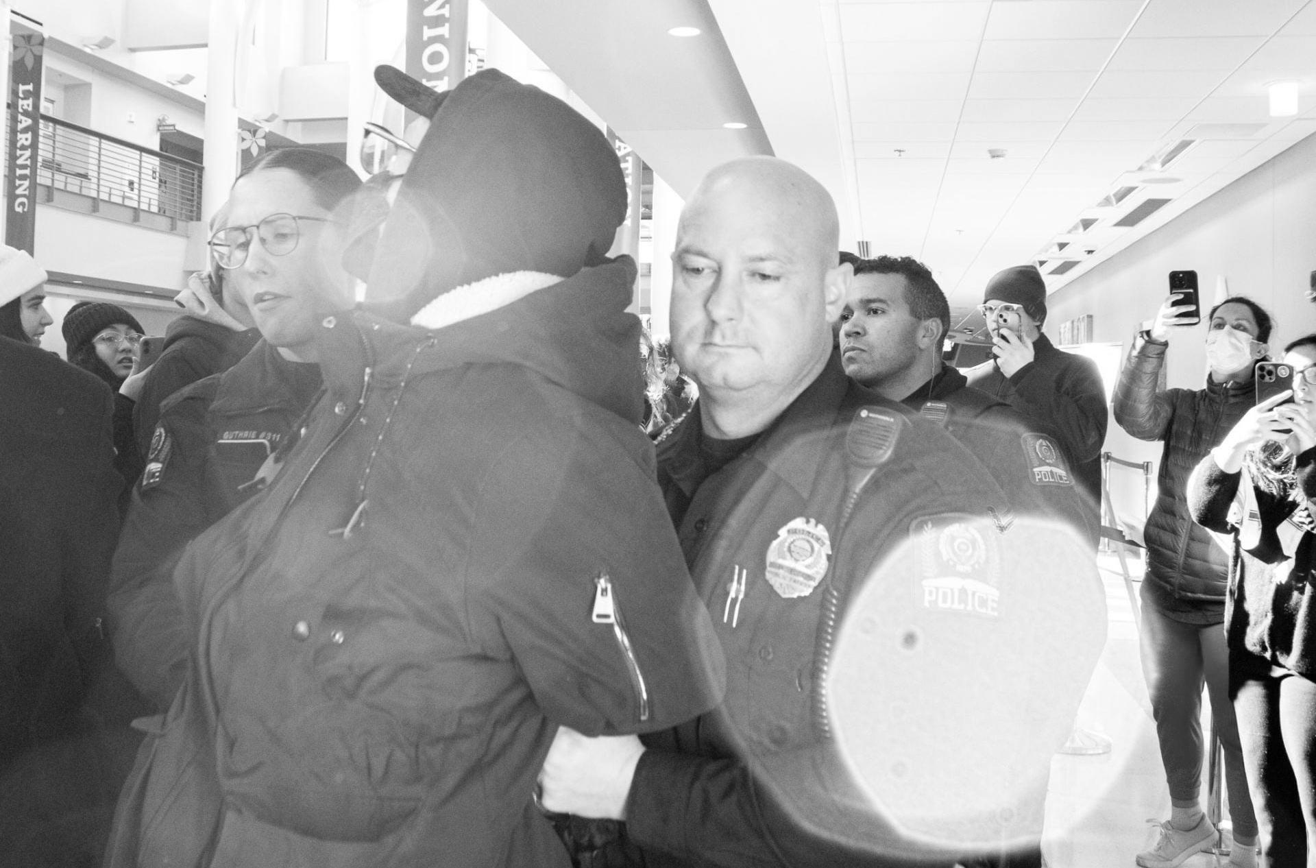 About 60 protesters chanted in the lobby and through the second floor ballroom where the fair took place. Eventually, three people, two of them students, were arrested for refusing to comply with space standards set by the university.