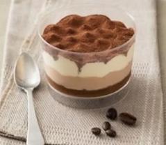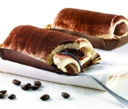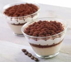 Coffee and Zabaione cream on a layer of sponge cake soaked in espresso, dusted with cocoa powder.