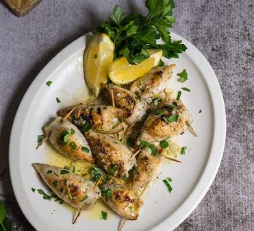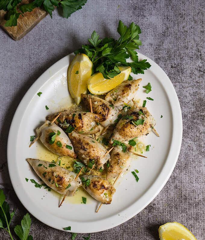 7. Once all the calamari are seared, place them all back in the pan, add the wine, minced garlic, capers, lemon juice and butter. Season with salt and pepper, and place in the oven loosely covered with foil, for about 20 minutes.