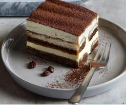 Sponge cake soaked in espresso, topped with mascarpone cream and dusted with cocoa powder