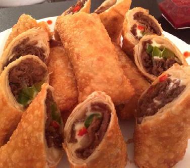 2. Arrange 8 egg roll wrappers on a flat surface; place a half cheese slice on each one. Layer an equal amount of steak-onion mixture on top of each cheese slice. Roll up wrappers according to package directions and seal edges, wetting with water if necessary.