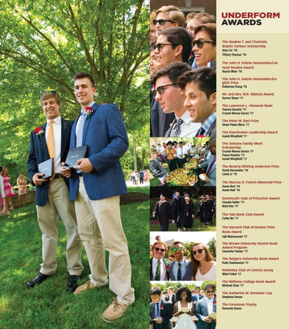 UNDERFORM AWARDS The Reuben T. and Charlotte Boykin Carlson Scholarship Alan Lin ’18 Tiffany Thomas ’18 The John H. Imbrie Humanities/Cultural Studies Award Haaris Mian ’19 The John H. Imbrie Humanities/English Prize Katherine Xiong ’19 Mr. and Mrs. W.R. Niblock Award Darren Shum ’17 The Lawrence L. Hlavacek Bowl Yiannis Vandris ’17 Crystal Nieves Garcia ’17 The Peter W. Dart Prize Ghael Fobes Mora ’17 The Eisenhower Leadership Award Isaiah Wingfield ’17 The Semans Family Merit Scholarship Crystal Nieves Garcia ’17 Panos Vandris ’17 Isaiah Wingfield ’17 The Beverly Whiting Anderson Prize David Hernandez ’19 Linda Li ’19 The Marcus D. French Memorial Prize Owen Bird ’19 Annie Hait ’19 Dartmouth Club of Princeton Award Claudia Beller ’17 Matt Kim ’17 The Yale Book Club Award Cathy Wu ’17 The Harvard Club of Boston Prize Book Award Injil Muhammad ’17 The Brown University Alumni Book Award Program Charlotte Palmer ’17 The Rutgers University Book Award Katie Santamaria ’17 Wellesley Club of Central Jersey Nikki Pallat ’17 The Williams College Book Award Michael Zhao ’17 The Katherine W. Dresdner Cup Stephens House The Foresman Trophy Kennedy House
