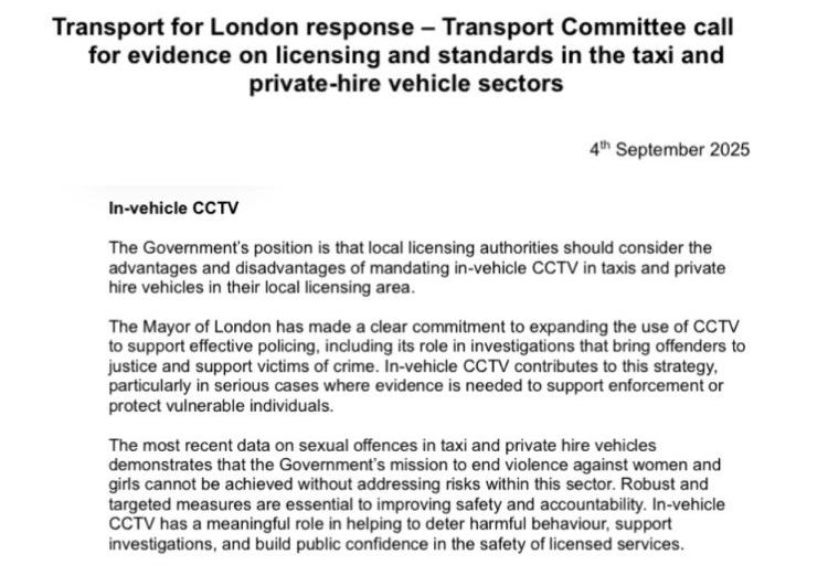 TfL themselves have highlighted the huge benefits of in-vehicle CCTV in their submission to the Transport Committee on licensing and standards (September 2025). They stated that CCTV supports effective policing, helps bring offenders to justice, protects victims of crime, and is particularly valuable in serious cases where evidence is needed to enforce the law and safeguard vulnerable passengers.