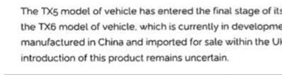 Apart from yet more huge losses, the Company states: “The TX5 model of vehicle has entered the final stage of its product lifecycle. The product will be replaced by the TX6 model of vehicle…. Management currently expect TX6 vehicles to be manufactured in China and imported for sale within the UK market. The timing of the development and introduction of this product remains uncertain.” So, we now know that not only is the current TXe taxi on run-out, Ansty will no longer build taxis, but it is seriously in doubt when and even whether we get a new replacement.