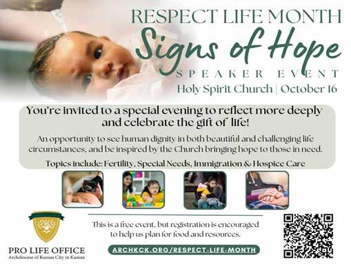 On Oct. 16, Holy Spirit Church in Overland Park will host our first Respect Life Month “Signs of Hope” speaker event. This is an opportunity to see human dignity in both beautiful and challenging life circumstances and be inspired by the church bringing hope to those in need.