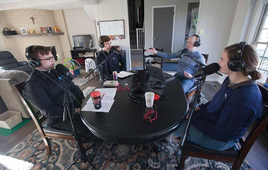 Lee McMahon, consultant for evangelization for the archdiocese (third from left), hosts a weekly podcast called New Manna, which focuses on the Eucharist. Here he interviews, from left, archdiocesan seminarian Aaron Waldeck and Deacon Timothy Skoch, who will be ordained a priest in May, and Lucy Skoch, Deacon Skoch’s sister.