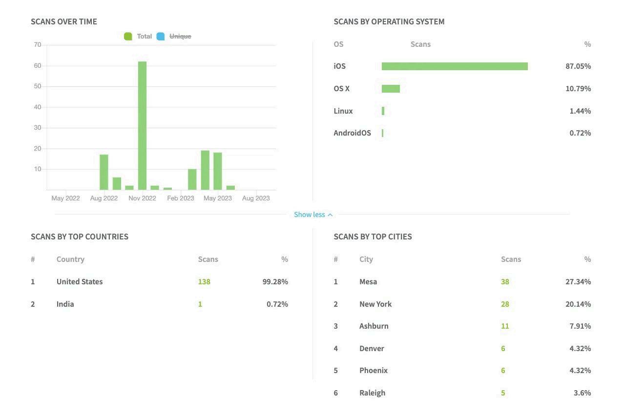 You can easily access information on how many times the code has been scanned, what type of operating systems were used to scan it, and even where in the country or world the code was scanned the most or at least where the scanning devices are based.