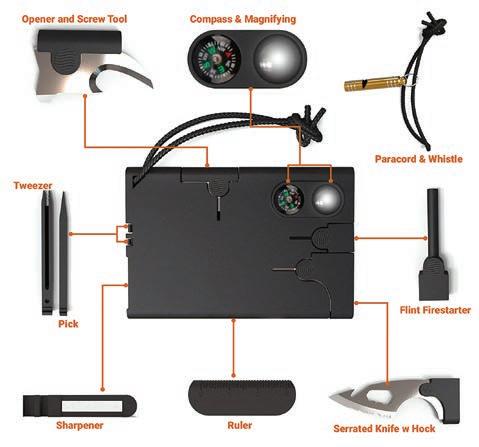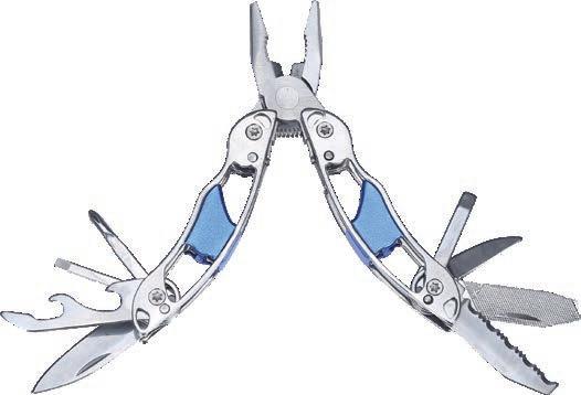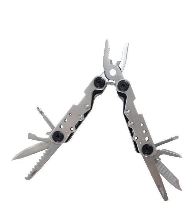 The perfect companion for your camping, fishing, and hiking adventures. Equipped with needle nose and standard pliers, wire cutter, 2 flathead screwdrivers, saw, Phillips head screwdriver, nail file, blade, ruler, hook remover, fish scaler, bottle opener, and can opener.