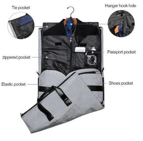 • Includes 1 large zippered duffel bag storage section with inside zippered pocket, 1 large zippered laptop sleeve with 2 smaller zipper pockets on front, 1 large zippered side pocket, 2 mesh pockets and 2 zippered pockets on back with several clipping loops, several tightening straps with quick side release buckles.