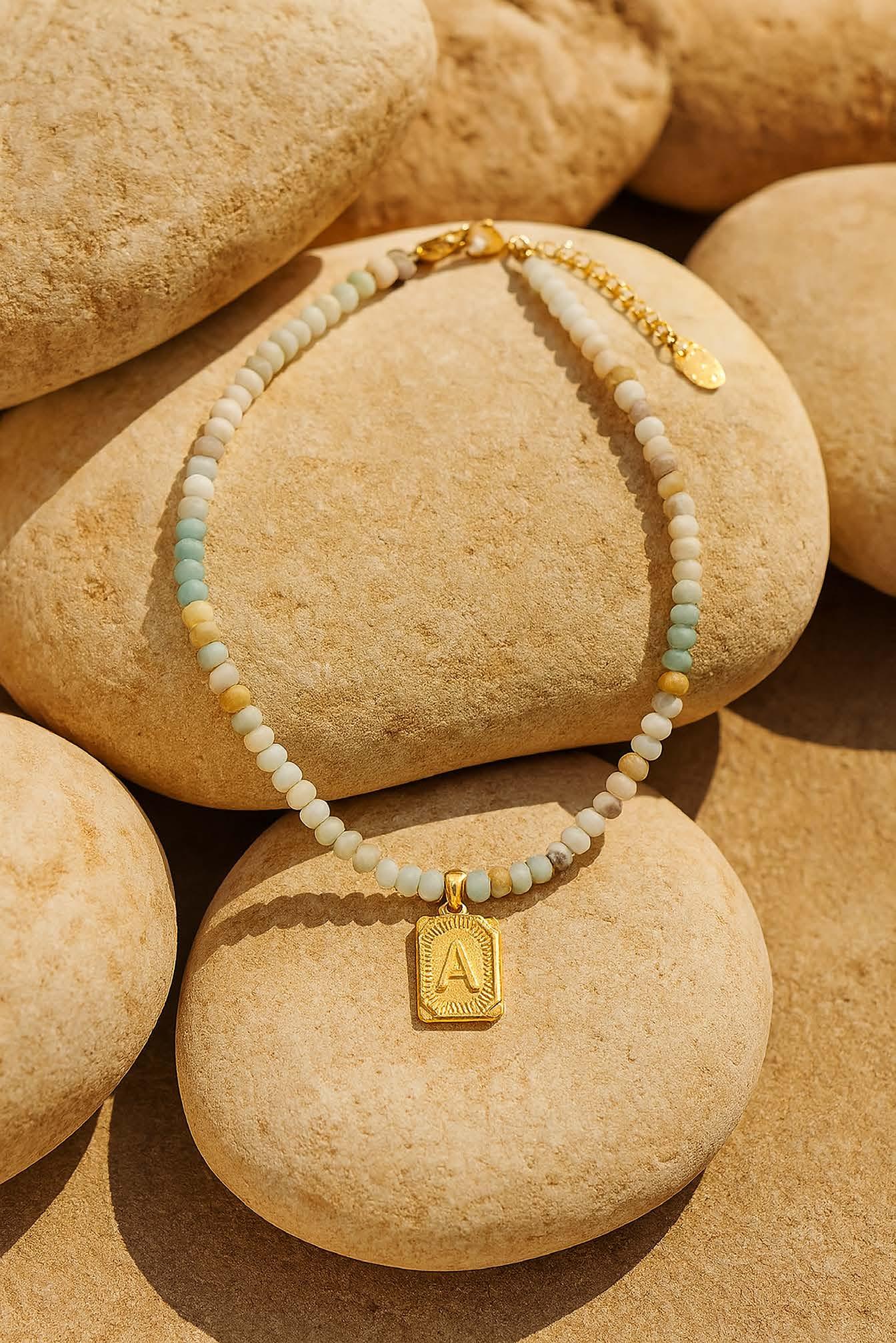 Colorful and eye-catching, this necklace combines natural stones with a bold letter pendant. Each piece is unique, showcasing vibrant hues that make every necklace one of a kind.
