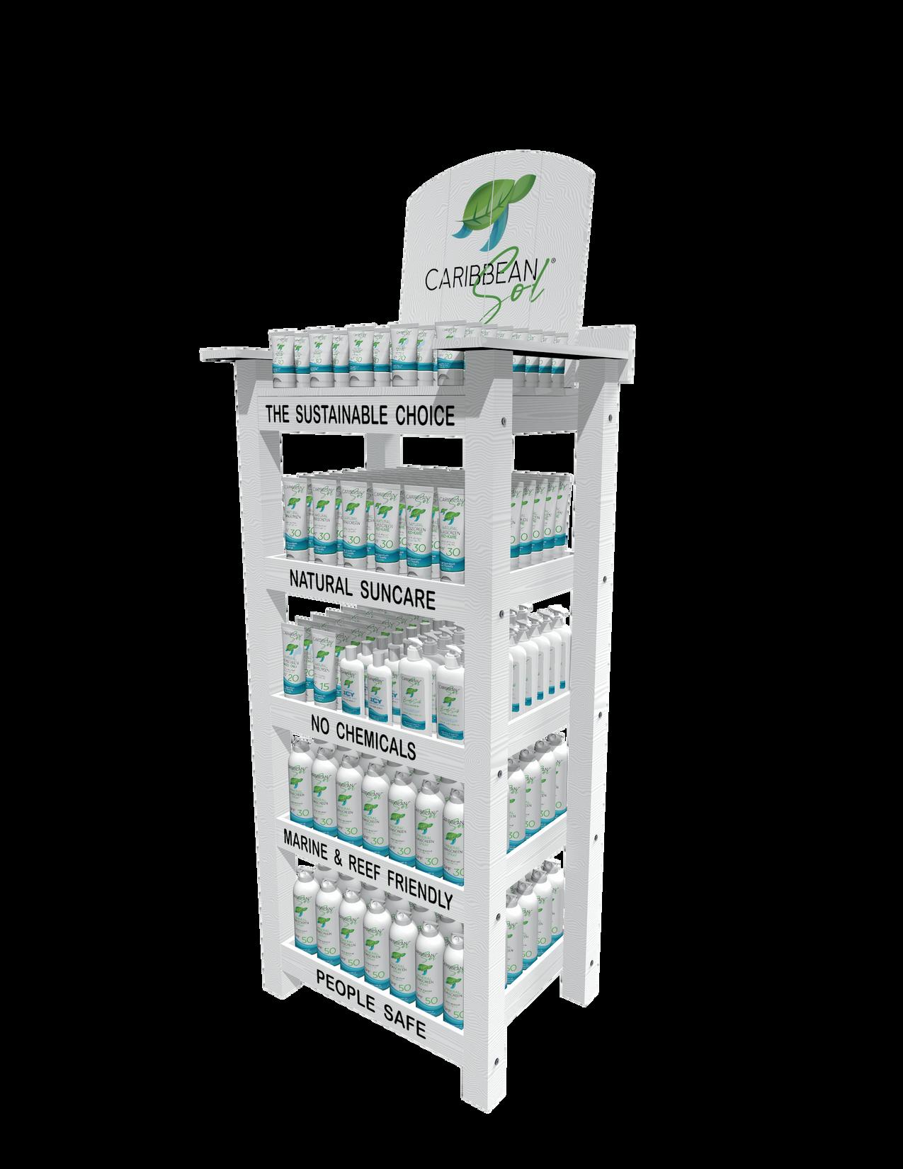 Dimensions : 22" W x 22" D x 71" H ITEM # 18911 (DISPLAYED) Display includes: Top Selling SPF After Sun Bath Line
