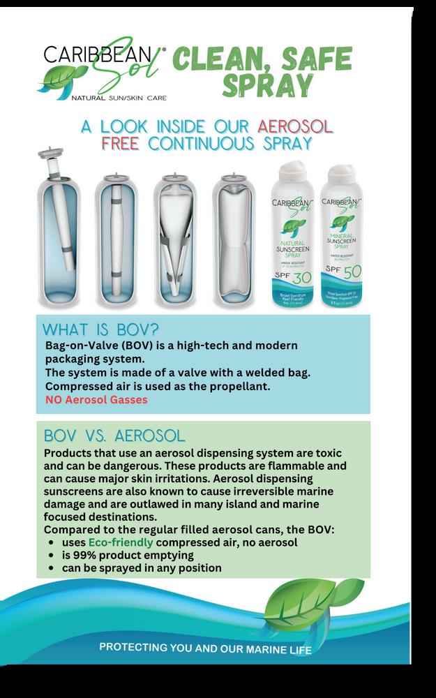The Mineral SPF 30 & SPF 50 spray uses a unique, aerosol-free Bag-On-Valve dispensing system that allows for a steady spray of sunscreen without polluting the air or the skin with harmful gas aerosols.