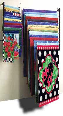 Our 9 Arm Flag Display ts into pegboard or slatwall, and each of the 9 arms holds several Minis, Monograms, Large Flags, or Mailbox Makeovers.