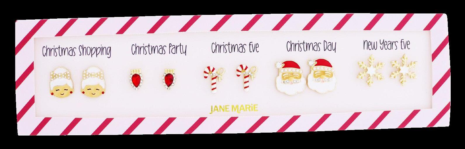 Set of 5 Occasions Wreath, Present, Snowflake, Christmas Tree, Pearl Earring, .5”, .25”, .5”, .5”, .25” Top to Bottom
